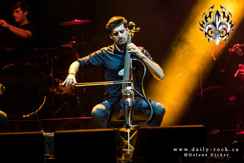 Dès leur apparition sur la scène, nous pouvons entendre certains spectateurs lancés des «je vous aime!» aux deux musiciens, qui semblent d’ailleurs jouir d’une forte popularité auprès de leur auditoire féminine. 2Cellos entame la soirée avec une interprétation de Chariot of Fire de Vangelis. L’orchestre, composé de plusieurs violonistes, violoncellistes, d’un synthétiseur et d’une contrebasse, est mis en contraste par un éclairage diffus alors que les projecteurs sont orientés vers le duo afin qu’ils capturent notre attention sur scène. En hauteur, un écran géant projette des animations inspirées du film d’où proviennent les chansons. Le jeu des deux violoncellistes y est également montré, ils sont effectivement filmés en contrebas afin que les spectateurs plus éloignés aient accès à toute l’intensité de leur performance. 2Cellos possède un nombre impressionnant de vidéoclips, et ils seront systématiquement diffusés lors de l’interprétation des différents morceaux.