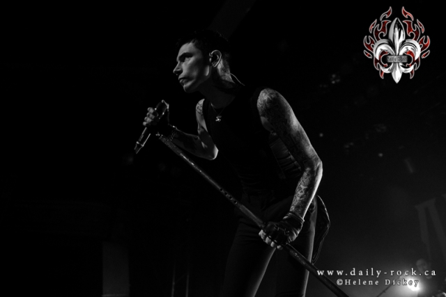 Dès 21 h 15 la tête d’affiche Andy black entre en scène. Aucun décor sur la scène à l’exception d’une toile en fond de scène affichant le nom du chanteur. Il est accompagné par un guitariste et un batteur installé chacun à une extrémité de la scène, laissant le centre complètement libre.