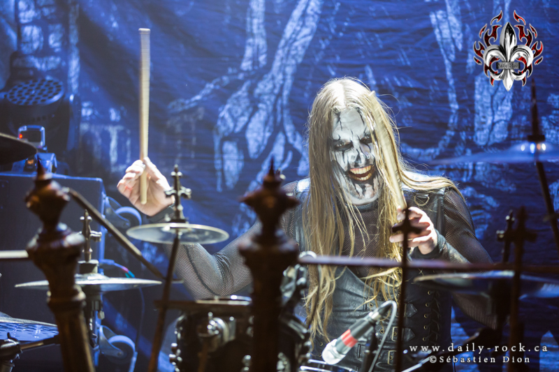 Fut ensuite la tour de Carach Angren. Que dire de cette formation de Black Metal Symphonique des Pays-Bas. Leur mise en scène, projections et éléments de décor leur volaient pratiquement la vedette. Tout commença avec la projection du fantôme d’une jeune fille dans un miroir dans un coin, suivi de l’entrée des musiciens, bien concentrés sur leur personnage. Digne d’un tour de magie, le claviériste fit apparaître son clavier des brumes à l’aide d’un bras robotisé, aux allures de personnage paranormal. À peine leur entrée théâtrale terminée que la formation entama sa première chanson devant la foule encore surprise. Ils enchaînèrent les titres, offrant quelques autres projections de l’autre monde et quelques interventions de Seregor, leur chanteur.