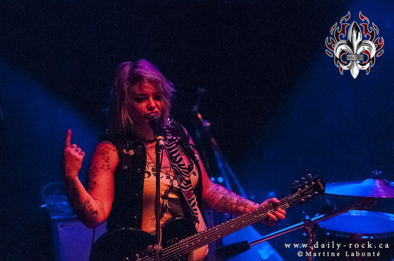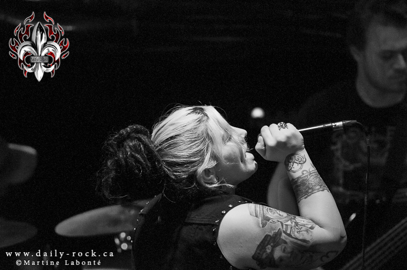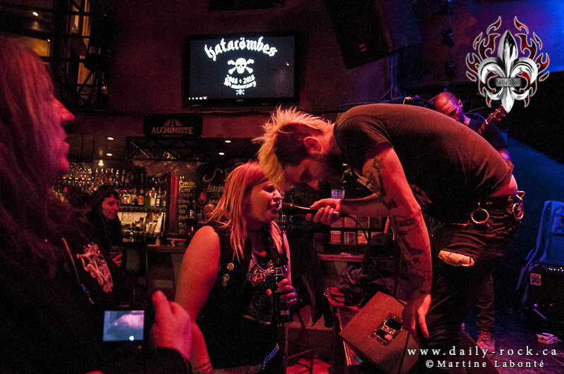 La formation No Chaser est la prochaine à se produire. Complètement féminine, les quatre filles s’en donnent à cœur joie sur la scène des Katacombes. Elles ont vite fait de remplir la salle avec leur punk rock accrocheur. Un beau moment passé en compagnie du groupe montréalais qui gagne à être connu. Elles mettent la table avec succès pour Murder the Elite, composé de Marie-Ève, Chouin, Alex et Kate. L’hôte et fêtée, a donné une solide prestation et a invité une deuxième voix sur scène, Joanie St-Laurent, pour quelques chansons. Il ne reste que deux groupes à la soirée quand Bludgeoned monte sur scène. Un groupe doom punk de cinq membres. Mariane, Martin, Vince, Paul et John forment la bande issue de Montréal. Il mettent de l’ambiance pour accueillir la dernière formation de la soirée, Les Horny Bitches. Les filles qui seront en spectacle notamment avec Bigwig et aussi au Rockfest plus tard cet été donnent toujours une performance endiablée. Les filles reviennent d’une tournée européenne et savent comment dominer la scène. Mel, Isabelle, Virginie et Marie s’amusent aux Katacombes les quatre comparses donnent autant de plaisir aux gens présents.