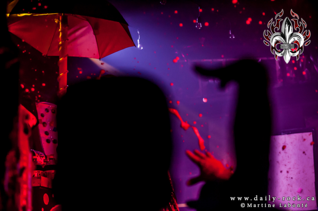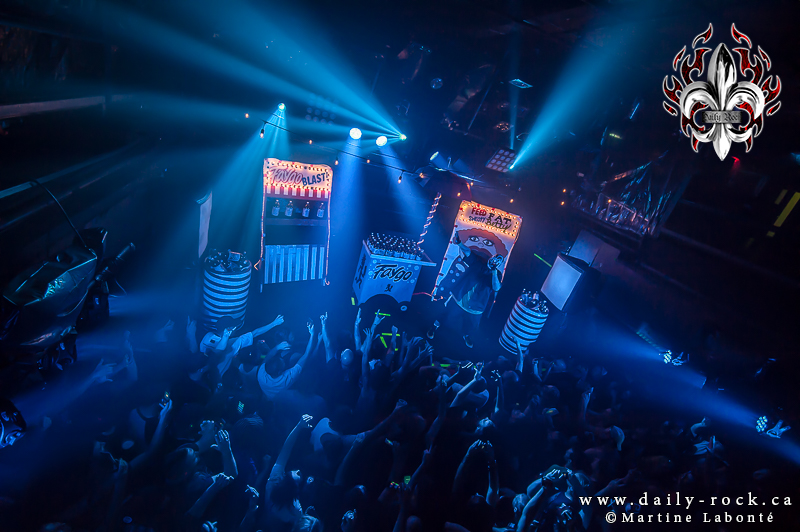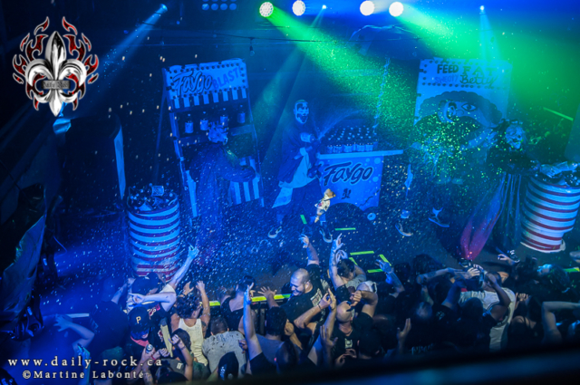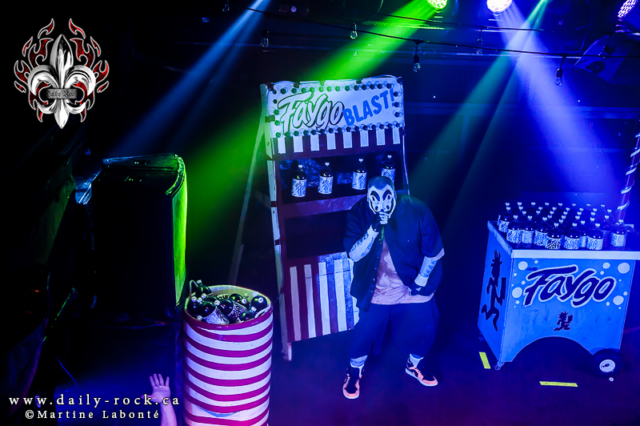 L’attente fut profondément longue pour les Juggalos et Jugallettes d’ici, comme si le train du Shangri-la nous avait oubliés, comme si les mythes ne nous concernaient plus. Vingt longues années avant de revoir ICP dans notre ville portant si accueillante aux bébites et aux freaks. Dans le public de ce soir, personne ne devait y être en 1998. Nous aurons été patients jusqu’à la toute dernière minute. Ce concert aura été annulé avant d’être reconfirmé dans la même semaine, et nous aurons facilement attendu trois-quart d’heure avant de les voir finalement se présenter sur scène avec un retard qui laissait transparaître chez le public une légère impatience, voire même un certain doute qu’il y aurait bel et bien un concert. Mais les producteurs District 7 Production et Xtrem Productions ont réussi un coup de maître car tout était parfait. La très grande majorité des pièces classiques ont été interprétées, outre deux ou trois chansons d’importance mises de côté (Bitches, Homies, Terrible, et la version un peu écourtée de Under the Moon, l’une de leurs meilleures pièces), Violent J et Shaggy 2 Dope ont livré l’offrande du quatrième Joker, The Great Milenko, à la hauteur d’une attente de deux décennies. Leurs voix étaient parfaitement en forme, l’enchaînement des pièces précis, la mise en scène impeccable, et le Faygo très abondant. Le plancher de danse s’est transformé en carnaval et a été inondé de jus de clown. La pluie aura enlevé le plus gros, mais les Foufs ont maintenant beaucoup de liquide au raisin à faire évacuer de leur salle de concert. Ce fut le spectacle le plus divertissant de l’année, de la décennie, peut-être de ma vie.