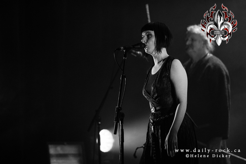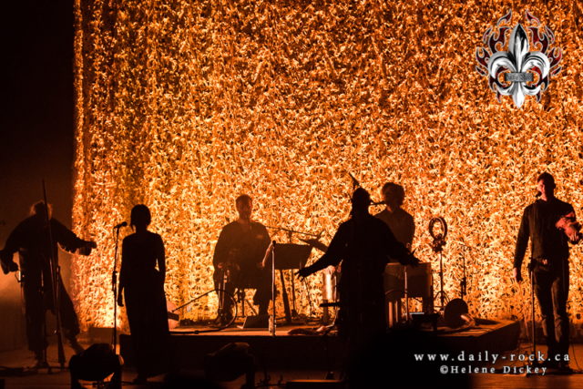L’éclairage tient un grand rôle dans l’ambiance et Wardruna utilise énormément le clair-obscur pour mettre en évidence tantôt un musicien, tantôt la scène. Divers projecteurs sont orientés vers les musiciens et créent des jeux d’ombre sur une immense toile texturée qui sert d’arrière-plan. Ces jeux d’ombre viennent accentuer l’impression que donne la musique de provenir d’un autre lieu, d’un autre temps. La scène dépouillée n’est habitée que par les musiciens et leurs instruments, qui sont nombreux et variés. Il y en a d’ailleurs plusieurs dont je ne connais pas le nom. Le groupe est très statique sur scène; même lorsque certains musiciens ne jouent pas, tous restent à leur place et demeurent immobiles, à l’exception près de la chanteuse qui danse légèrement de manière presque rituelle. L’aspect figé des artistes reflète notre propre inertie, et renforce la puissance de la musique et l’emprise qu’elle a sur nous.